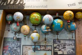 An alcove is set into the center of the wall and includes a sculpture created out of globes, a ships wheel, tools and vintage typewriters, set against the backdrop of images and a promotional map from 1890.