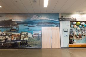 The wall uses vintage postcards and photographs to tell the story of education in Anacortes. All were digitally altered and enlarged.