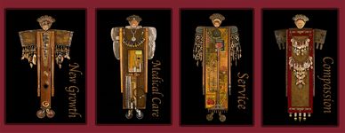 This installation is four Guardians created out of recycled mixed media, framed in shadow boxes. Each represents a theme selected by the Art committee for the hospital.